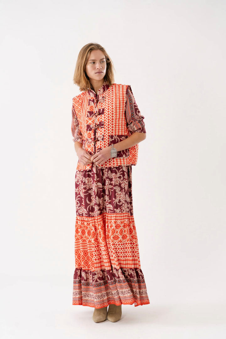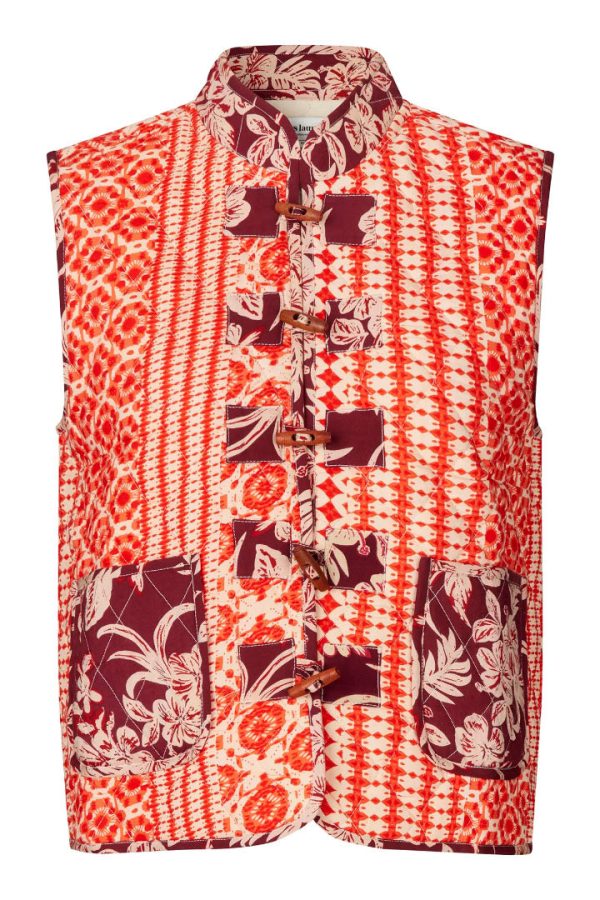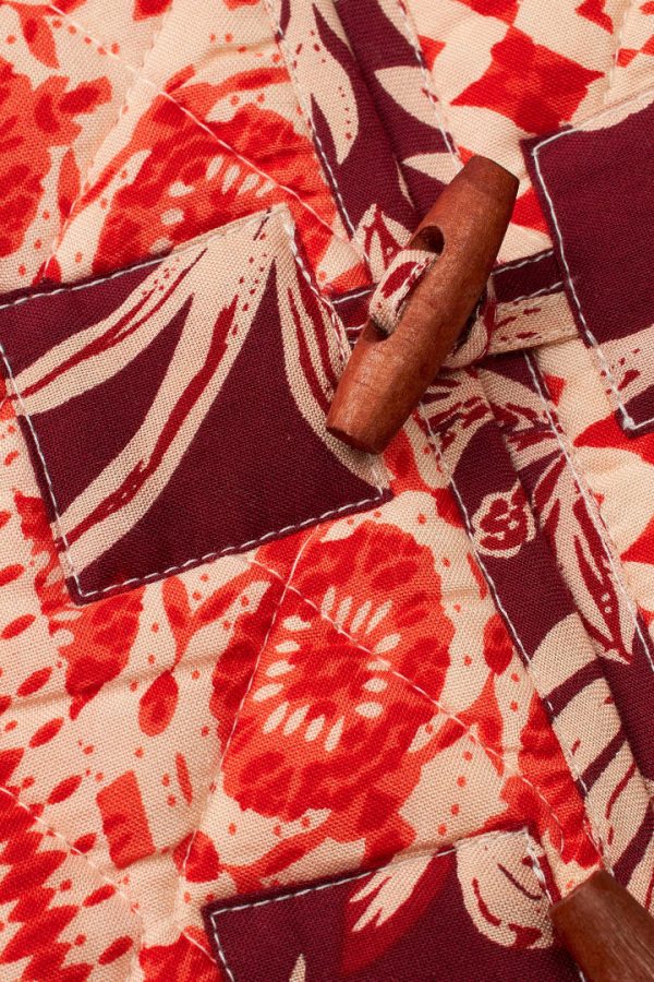 Add a touch of charm and style to your wardrobe with our Cairo Vest. This lightly padded vest features a quirky pattern, large buttons, and a unique round neck with a slightly standing collar. It’s perfect for any outfit; stay comfortable and fashionable with the Cairo Vest.