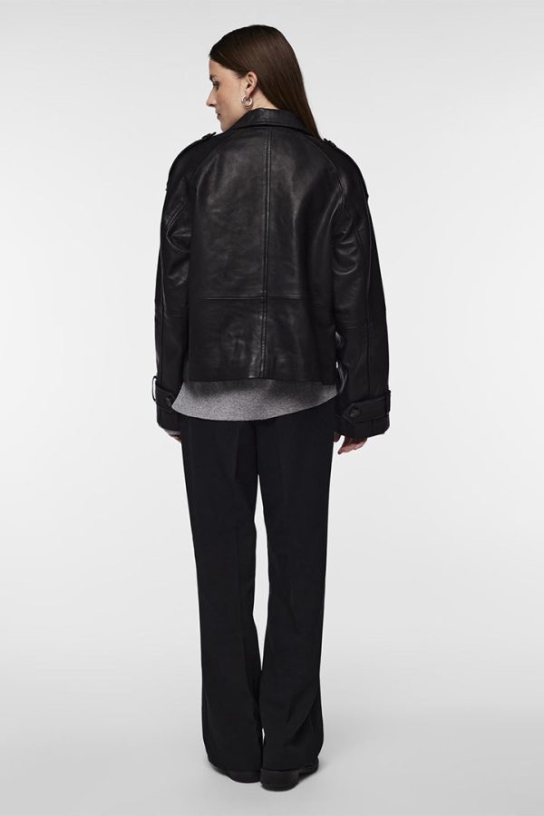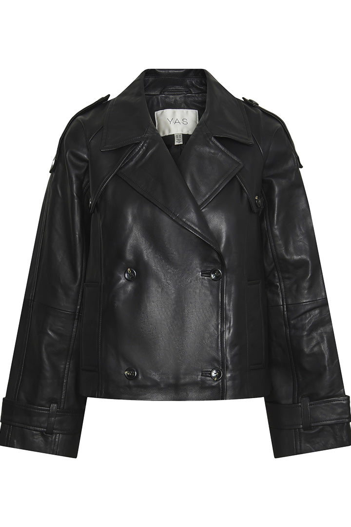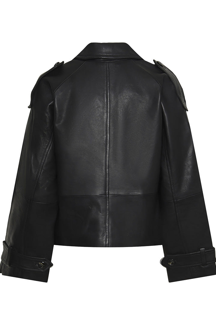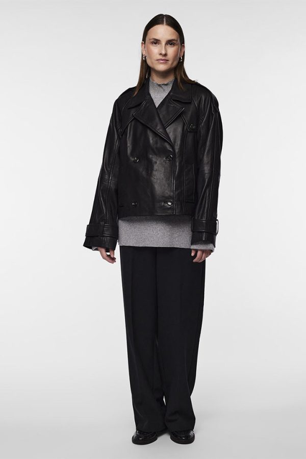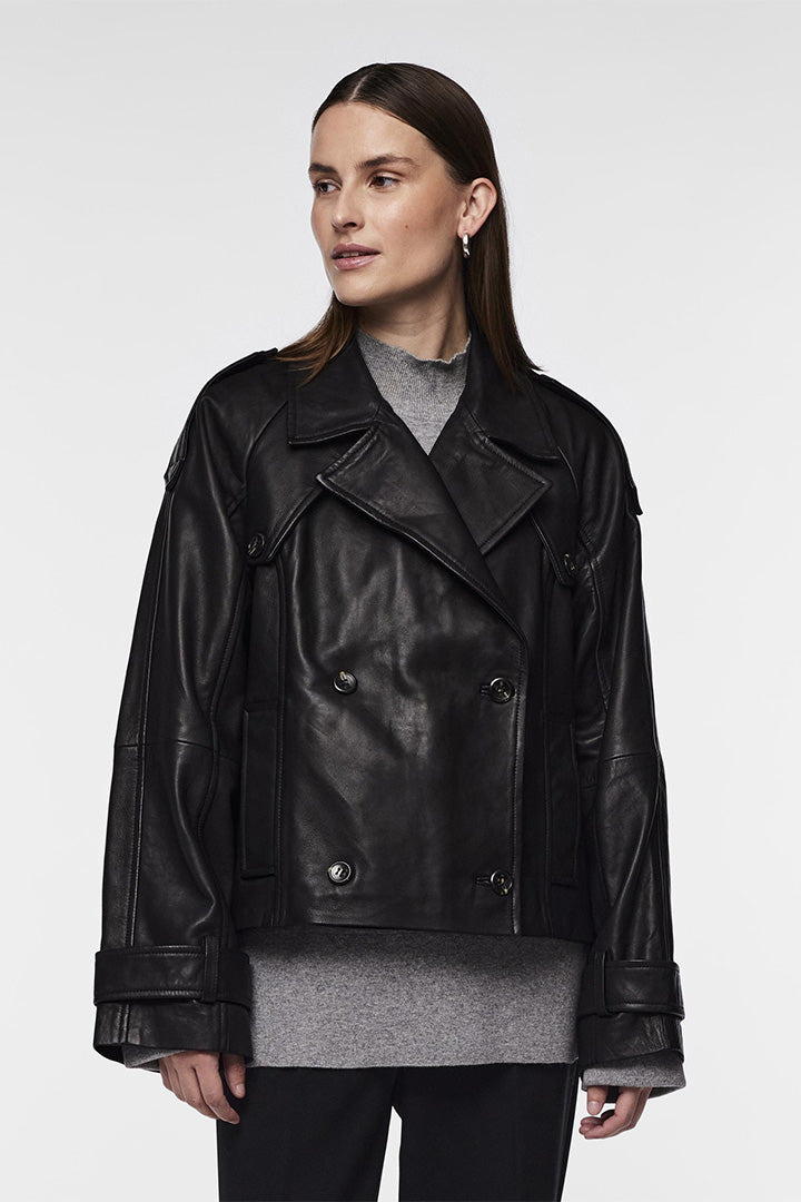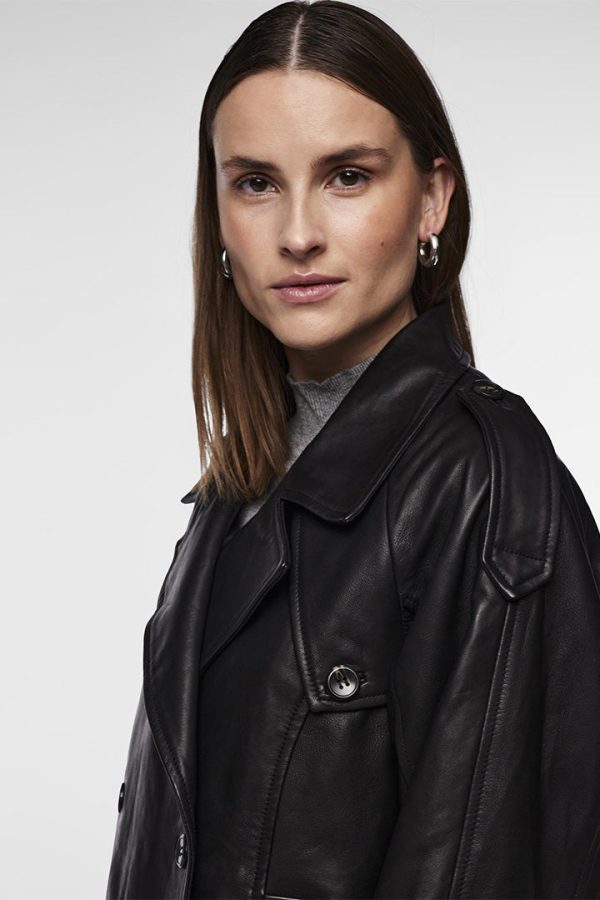 Upgrade your wardrobe with the essential Jules Leather Trench Coat. Crafted from premium black leather, this double breasted jacket adds a touch of timeless sophistication to any outfit. Don’t miss out on this must-have piece for an effortlessly stylish look.