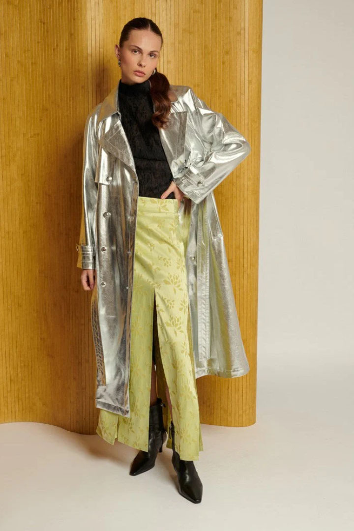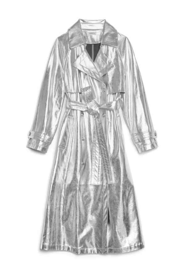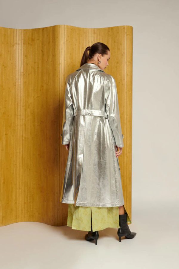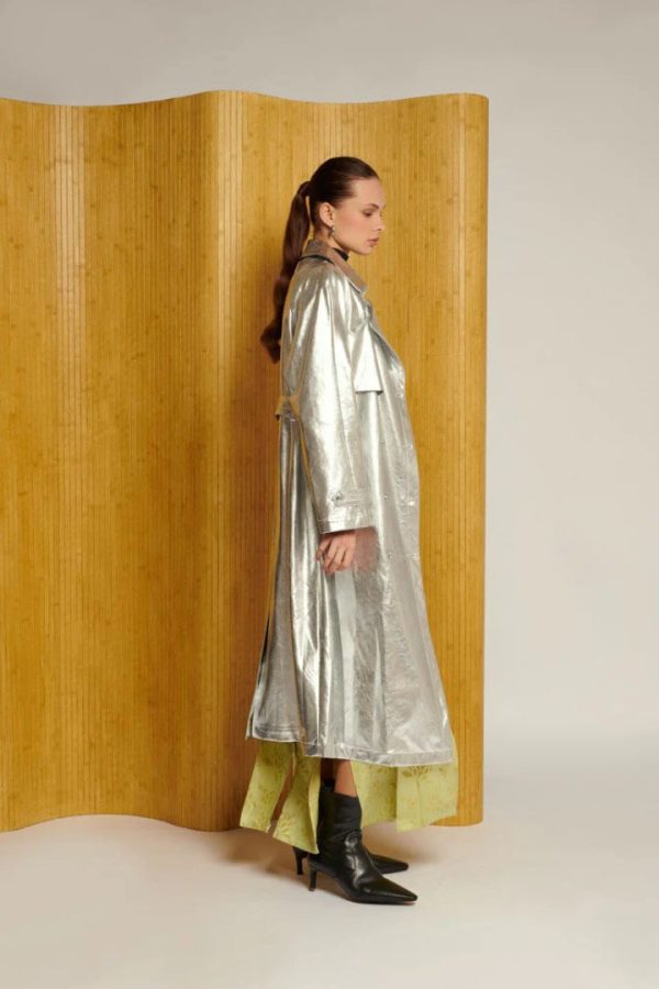 Add some shimmer to your wardrobe with the Brody Metallic Trench Coat. Boasting an oversized fit, front storm flaps, and a detailed belt, this silver jacket will make you stand out in style. Guard against the elements while turning heads with this must-have seasonal piece.